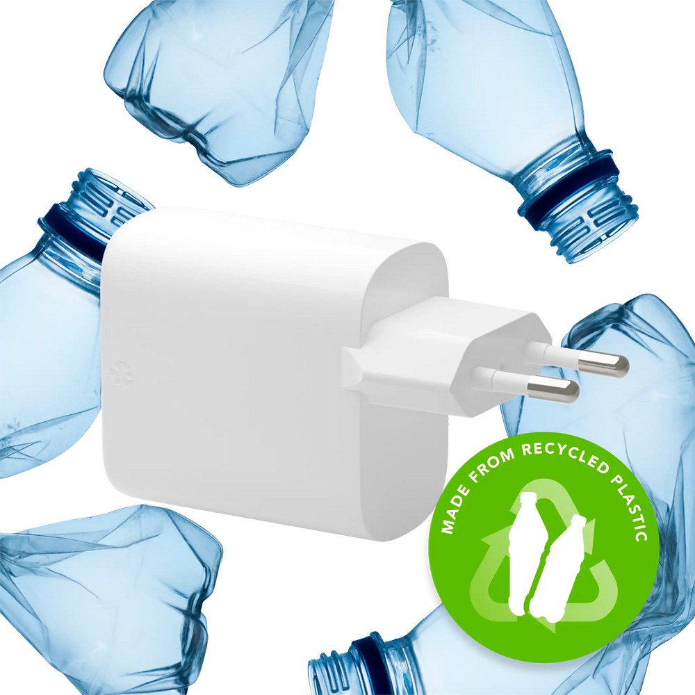 Lavet af 100% GRS-certificeret genbrugsplast, er opladeren ikke kun genanvendelig, men også et grønt valg, der støtter miljøvenlige løsninger. Med avanceret GaN-teknologi er den betydeligt mere kompakt og effektiv end traditionelle opladere. Denne teknologi sikrer, at opladeren bruger mindre energi, genererer mindre varme og dermed har en lavere energiforbrug, hvilket gør den til et miljøvenligt og effektivt valg.
