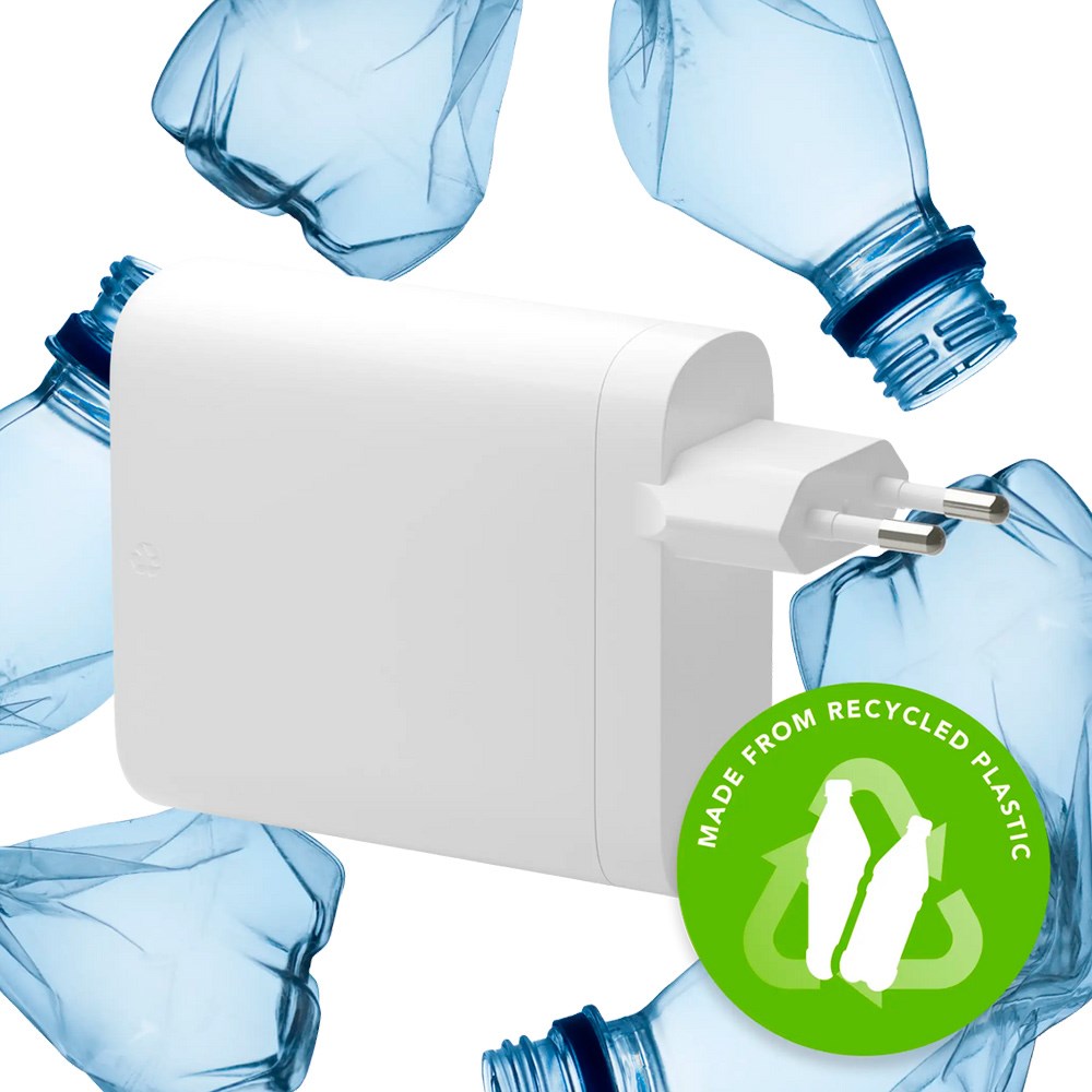 Lavet af 100% GRS-certificeret genbrugsplast, er opladeren ikke kun genanvendelig, men også et grønt valg, der støtter miljøvenlige løsninger. Med avanceret GaN-teknologi er den betydeligt mere kompakt og effektiv end traditionelle opladere. Denne teknologi sikrer, at opladeren bruger mindre energi, genererer mindre varme og dermed har en lavere energiforbrug, hvilket gør den til et miljøvenligt og effektivt valg.