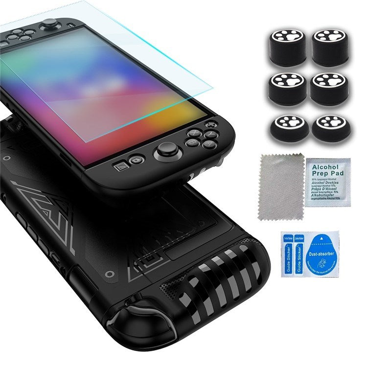 Sættet indeholder et slidstærkt cover i fleksibel og hård plast, en hærdet glasskærmbeskytter samt analoge stick-hætter for bedre greb og præcision.