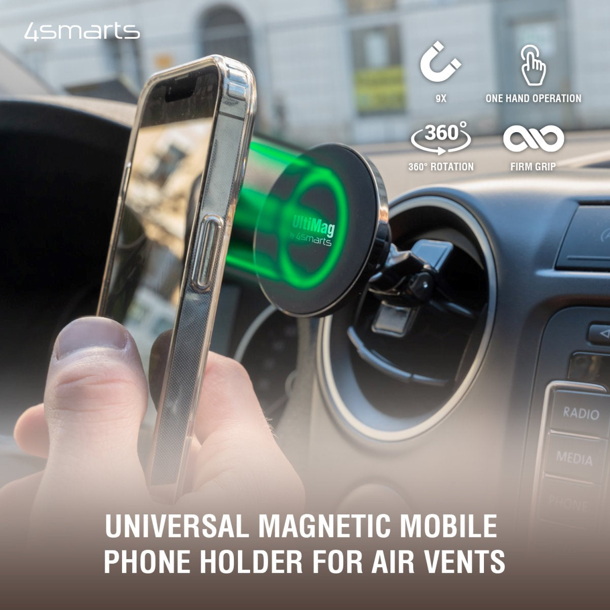 Med denne universal mobilholder fra 4smarts UltiMag serie er det muligt at bruge mobilen mens man kører bil.