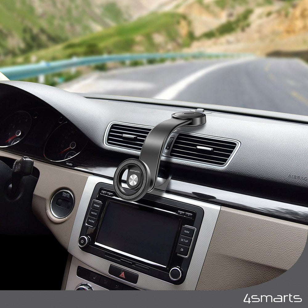 Oplev 4smarts Magnetic Flex - den ultimative magnetiske bilholder, der kombinerer stil og brugervenlighed. Med denne holder kan du nemt placere din MagSafe-smartphone eller enhver anden telefon ved hjælp af den medfølgende UltiMag-metalring, der sikrer kompatibilitet med bilmonteringen. De indbyggede magneter holder din telefon sikkert på plads, uanset vejrforholdene.