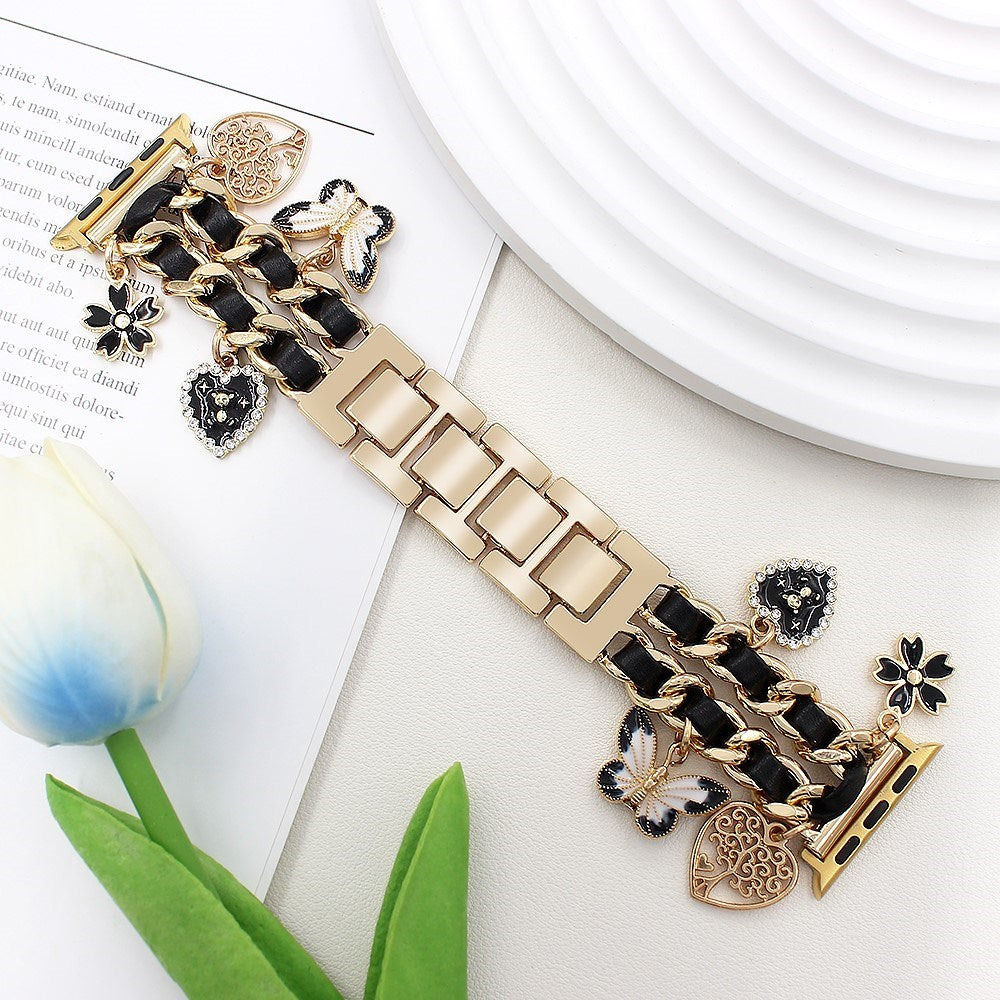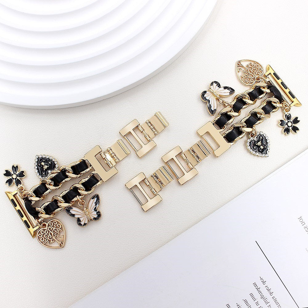Oplev den perfekte blanding af stil og romantik med EIDERWOODs Metalrem til Apple Watch (38 / 40 / SE / 41 / 42mm). Denne rem skiller sig ud med et elegant snoet kædedesign, der kombinerer holdbart metal og vegansk læder, og tilføjer et sofistikeret udtryk til dit Apple Watch. De smukke sommerfugle- og blomstervedhæng giver et feminint og unikt touch.