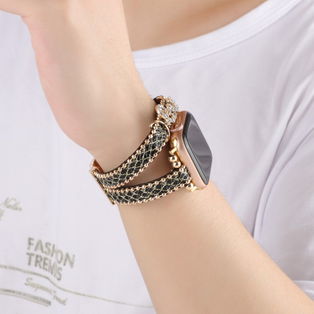 Apple Watch (38/40/SE/41/42mm) Metal og Læder Urrem m. Rhinsten - Guld / Sort