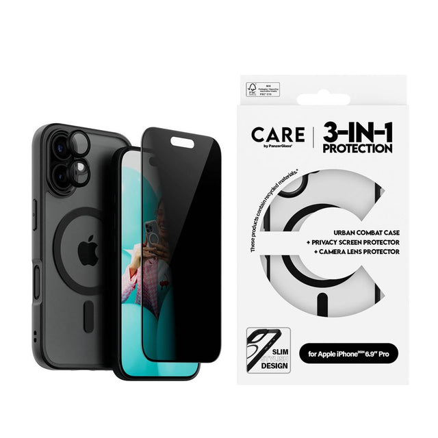 CARE By PanzerGlass iPhone 16 3-i-1 FLAGSHIP MagSafe Bundle - Privacy Skærmbeskyttelse (UWF) / Bagsidecover / Kamerabeskyttelse - Gennemsigtig / Sort
