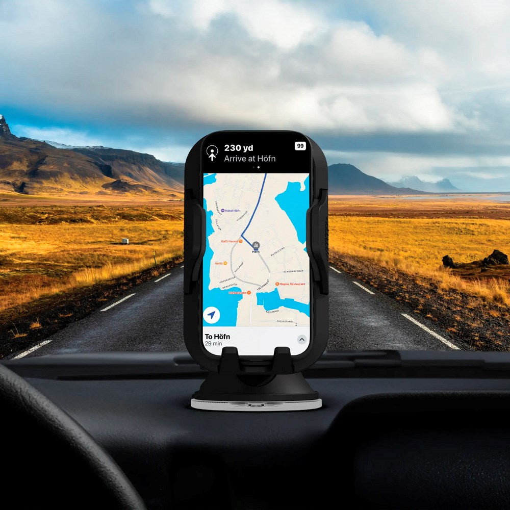 Den har en justerbar teleskoparm med 360° rotation, der sikrer optimal visning, og stabile, gummibelagte greb, som beskytter din mobil under kørslen. Justerbare klemmer og bundfødder holder mobilen sikkert på plads, og der er nem adgang til opladningsporten.