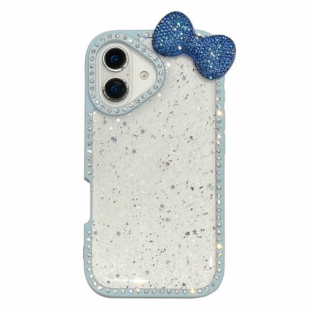 iPhone 16 Hybrid Bagside Cover m. 3D Sløjfe og Rhinsten - Gennemsigtig / Blå