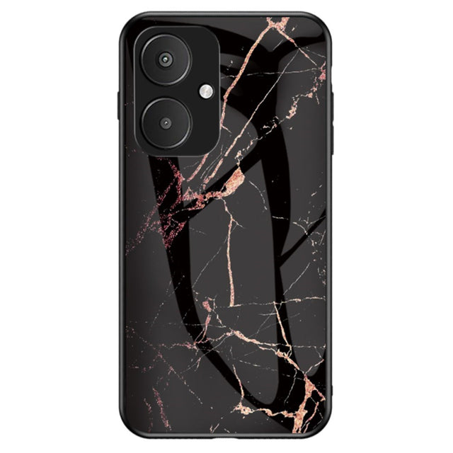 Under den meget solide glasbagside er der et super cool sort marmor design. Glasset på bagsiden gør, at designet og coveret ser lige lidt mere eksklusivt ud end et normalt Xiaomi Redmi 13C (5G) cover i plastik.
