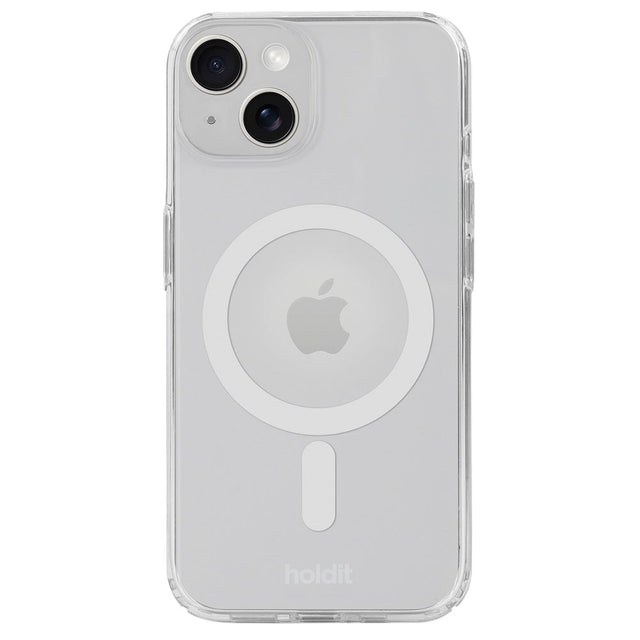 Et stilfuldt Holdit iPhone 15 / 14 / 13 MagSafe cover, der er fuldstændig gennemsigtigt, bortset fra den farvede MagSafe-ring på bagsiden af coveret.