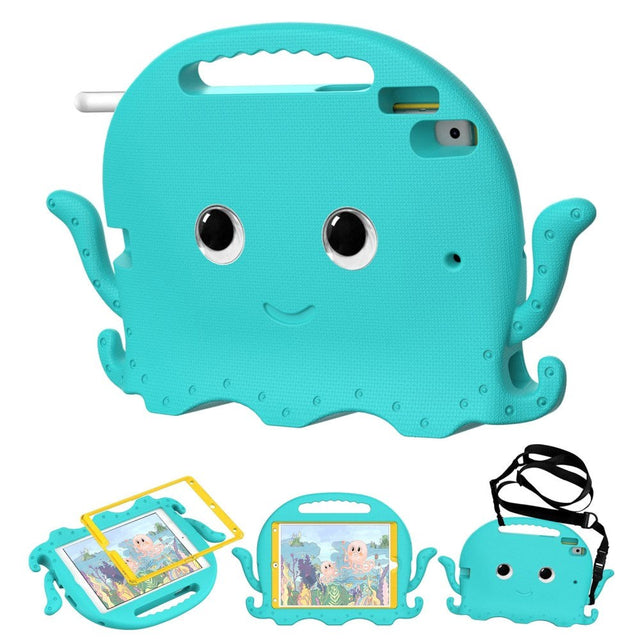 iPad 10.2" (2021 / 2020 / 2019) / iPad Pro 10.5 / iPad Air (2019) EVA Børnecover m. Skulderstrop - Blæksprutte Tema - Turkis