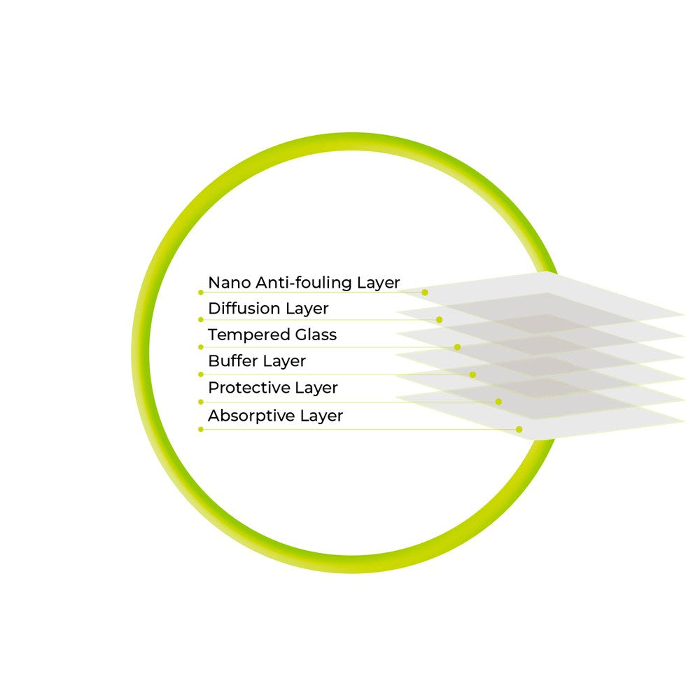 Det hærdede glas består af seks forskellige lag, som tilsammen giver stærk beskyttelse mod ridser, stød og andre skader, samtidig med at skærmens touch-følsomhed og klarhed bevares.