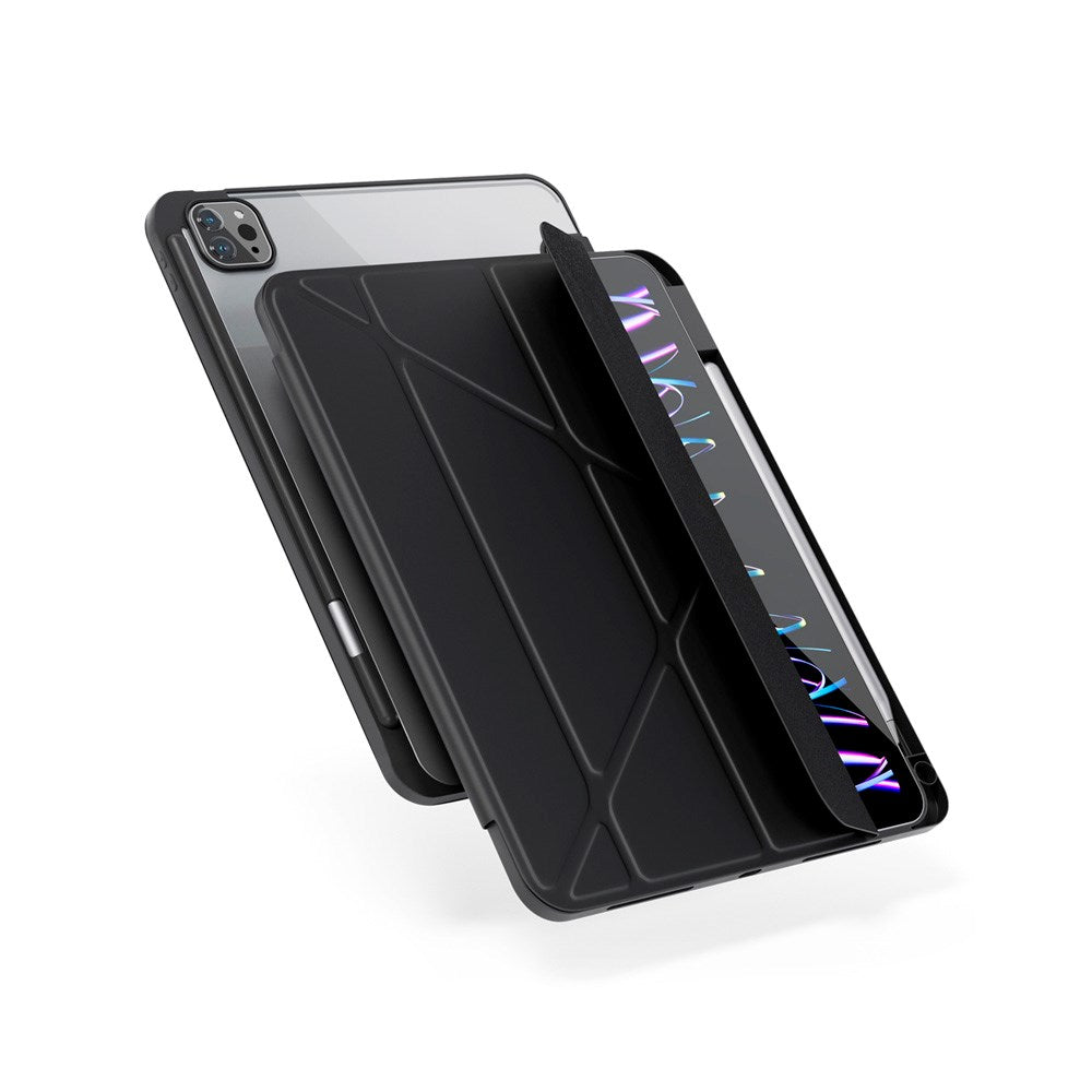 Med dets smarte, multifunktionelle design kan coveret foldes ud i et tri-fold stativ, der giver dig optimal synsvinkel, uanset om du arbejder eller slapper af med underholdning. Det origami-inspirerede design er ikke kun stilfuldt, det er også praktisk og ergonomisk. Bagsiden af coveret er konstrueret af stødabsorberende, fleksibel plastik, der effektivt beskytter din iPad mod uheldige stød og fald. Den gennemsigtige bagside lader dig vise din iPads originale design, samtidig med at den forbliver beskyttet mod ridser og skrammer.