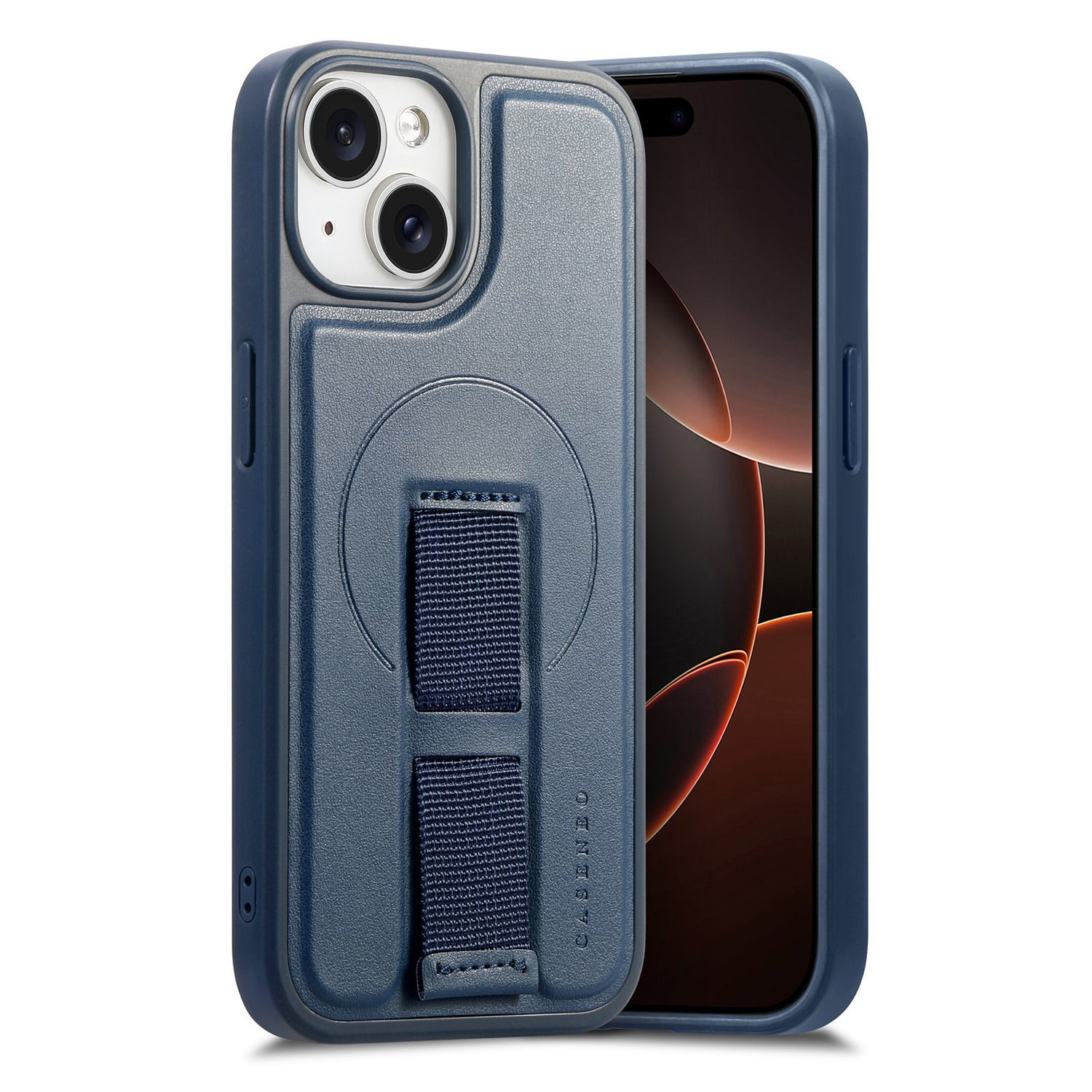 iPhone 14 / 13 - Hårdt Plastik Cover m. Kunstlæder Bagside & Fingerrem - MagSafe Kompatibel - Blå