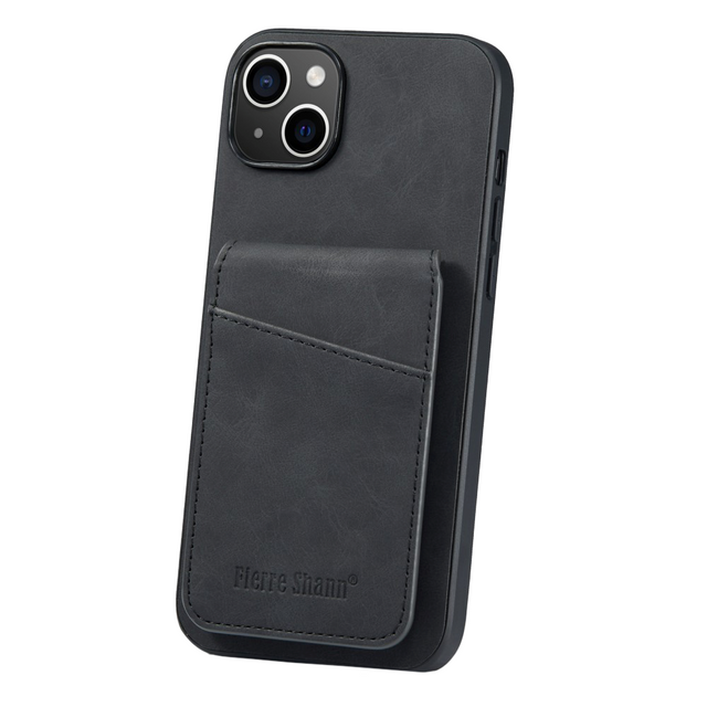 iPhone 14 Læderbelagt Plastik Bagside Cover m. Kortholdere og Ståfunktion - Sort