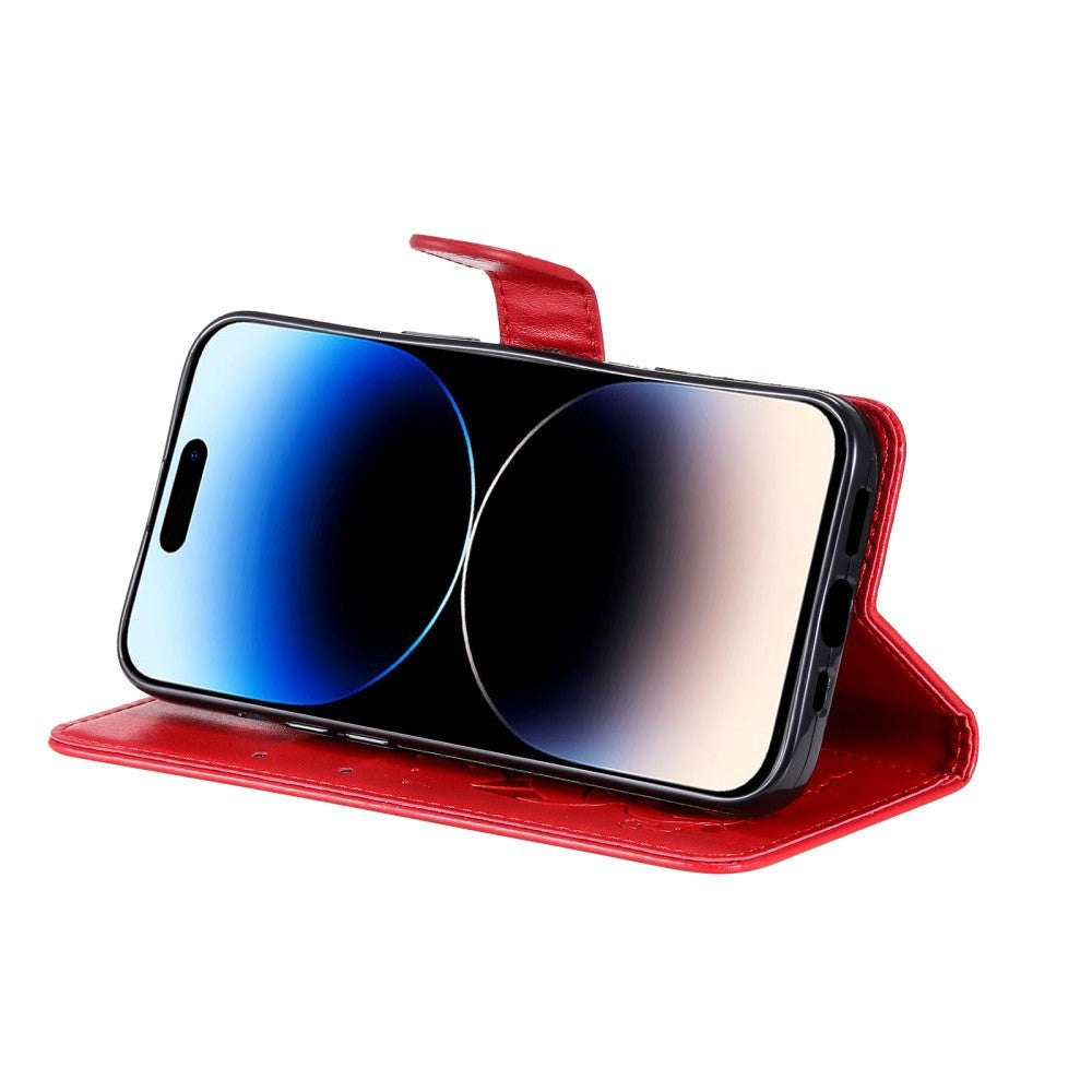 iPhone 15 Pro Læder Flip Cover m. Pung & Strop - Kat Indgravering - Rød er i restordre og vil blive sendt, så snart det er på lager igen.