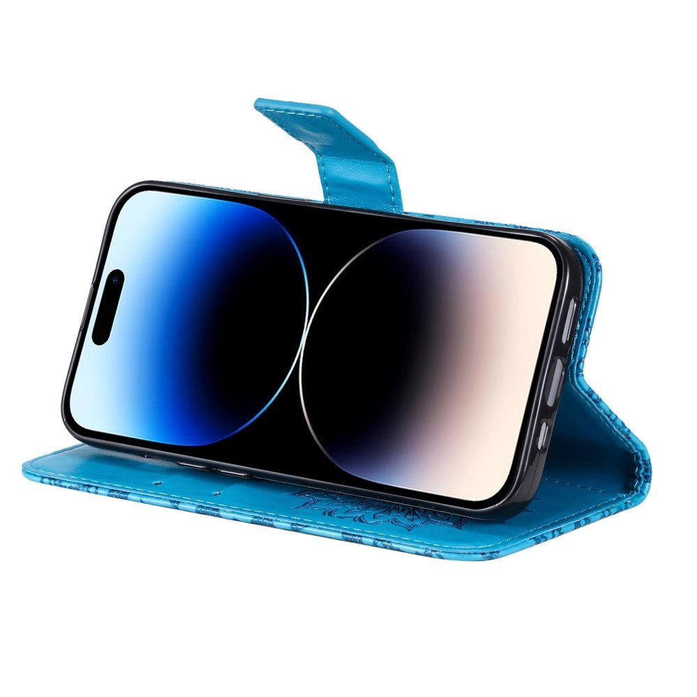 iPhone 15 Pro Læder Flip Cover m. Pung og Strop - Mandala Blomst - Blå