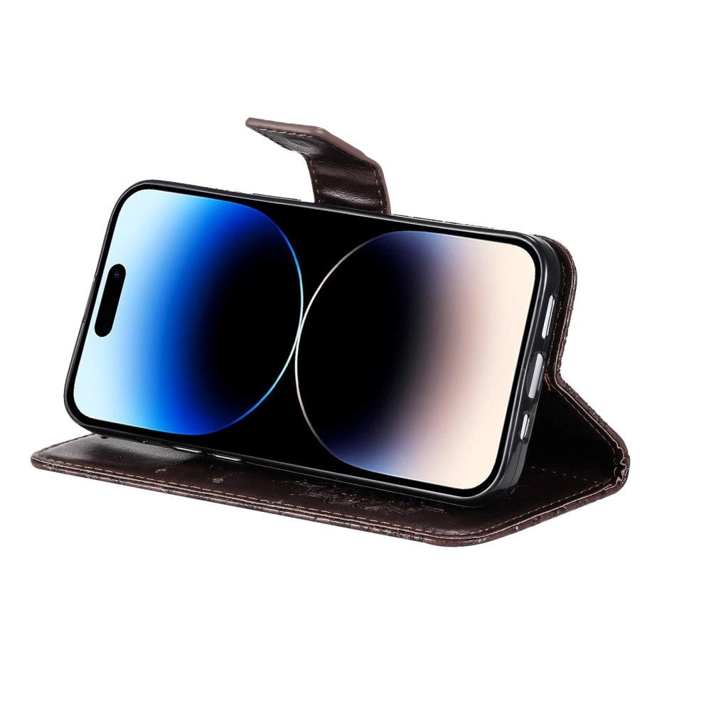 iPhone 15 Pro Læder Flip Cover m. Pung og Strop - Mandala Blomst - Mørkebrun