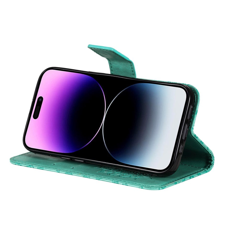 iPhone 15 Pro Max Læder Flip Cover m. Pung og Strop - Mandala Blomst - Grøn