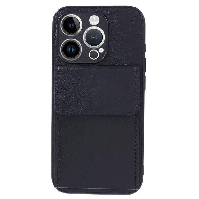 iPhone 15 Pro Max Læderbetrukket Fleksibelt Plastik Bagside Cover m. Kortholder - Sort