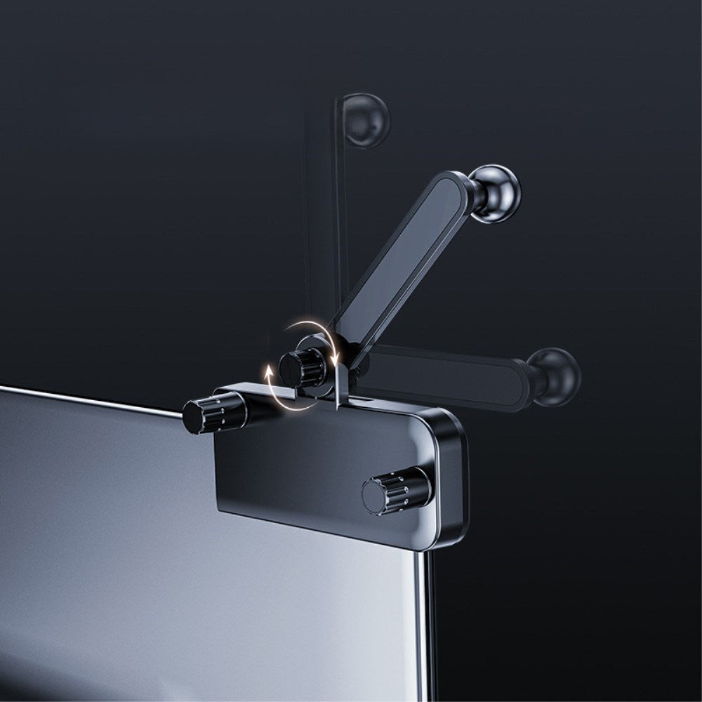 Installation er enkel: To skruer fastgør holderen til skærmens kant, mens en tredje skrue lader dig justere armens højde, så din telefon sidder perfekt.