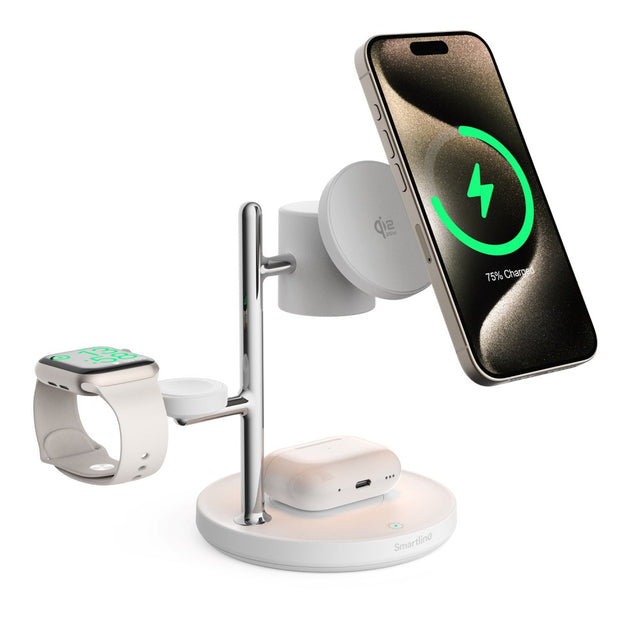 Denne Smartline 3-i-1 trådløse oplader gør det nemt at holde styr på dine enheder ved at oplade op til tre på én gang. Du kan lade både mobiltelefon, AirPods og smartwatch samtidig, uanset om det er Apple eller Samsung – helt uden at fylde natbordet eller skrivebordet med kabler.