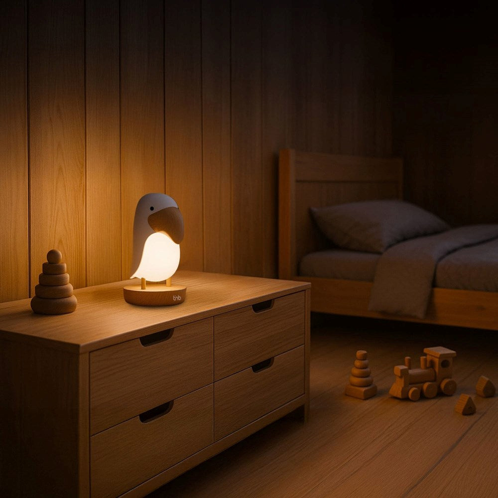 Tukan-natlampen fra T’nB er designet til at skabe ro og tryghed med en behagelig kombination af dæmpet belysning og afslappende lyde, som gør det nemmere at falde til ro – uanset alder. Lyset kan tilpasses efter behov, fra et diskret skær til et mere tydeligt lys, og i den særlige åndedrætsfunktion pulserer lyset langsomt, så rummet fyldes med en rolig og afslappende stemning.