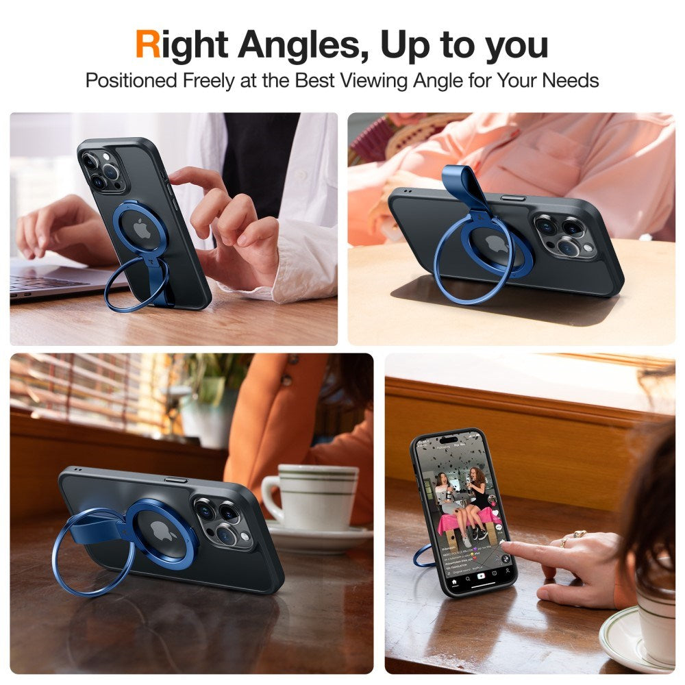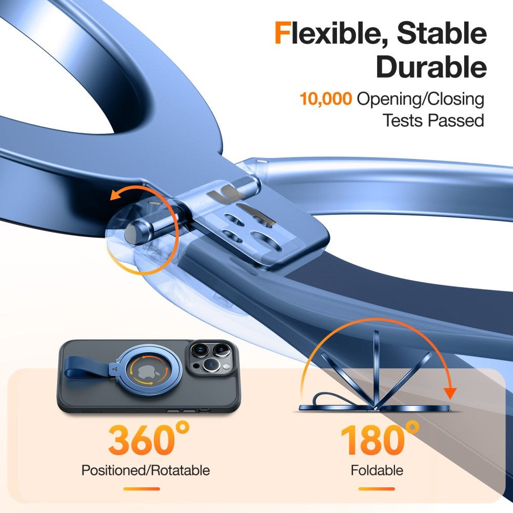 360° Roterbart Kickstand: Den magnetiske ring kan justeres til den optimale visningsvinkel, hvilket gør den perfekt til at se videoer, tage selfies, eller som holder på skrivebordet. Den kompakte og sammenklappelige konstruktion gør det nemt at opbevare den i lommen, når den ikke er i brug.