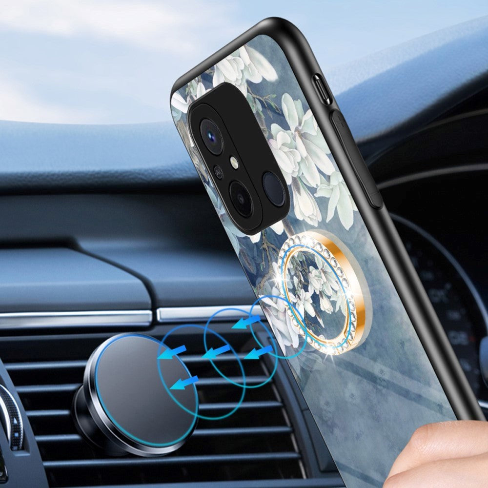 Under den meget solide glasbagside er der et super flot blomster design, som giver et flot udtryk og gør din mobil mere unik. Glasset på bagsiden gør, at designet og coveret ser lige lidt mere eksklusivt ud end et normalt Xiaomi Redmi 12C cover i plastik. Derudover er der også en finger ring på bagsiden, der giver dig et meget bedre greb omkring telefonen og derved mere sikkerhed. Denne finger ring kan også foldes om som en stander, dette er en dejlig feature hvis du tit ser film, serier eller YouTube på telefonen. Finger ringen er beklædt med rhinsten og er også magnetisk, og kan derfor sættes fast på diverse magnetiske overflader.